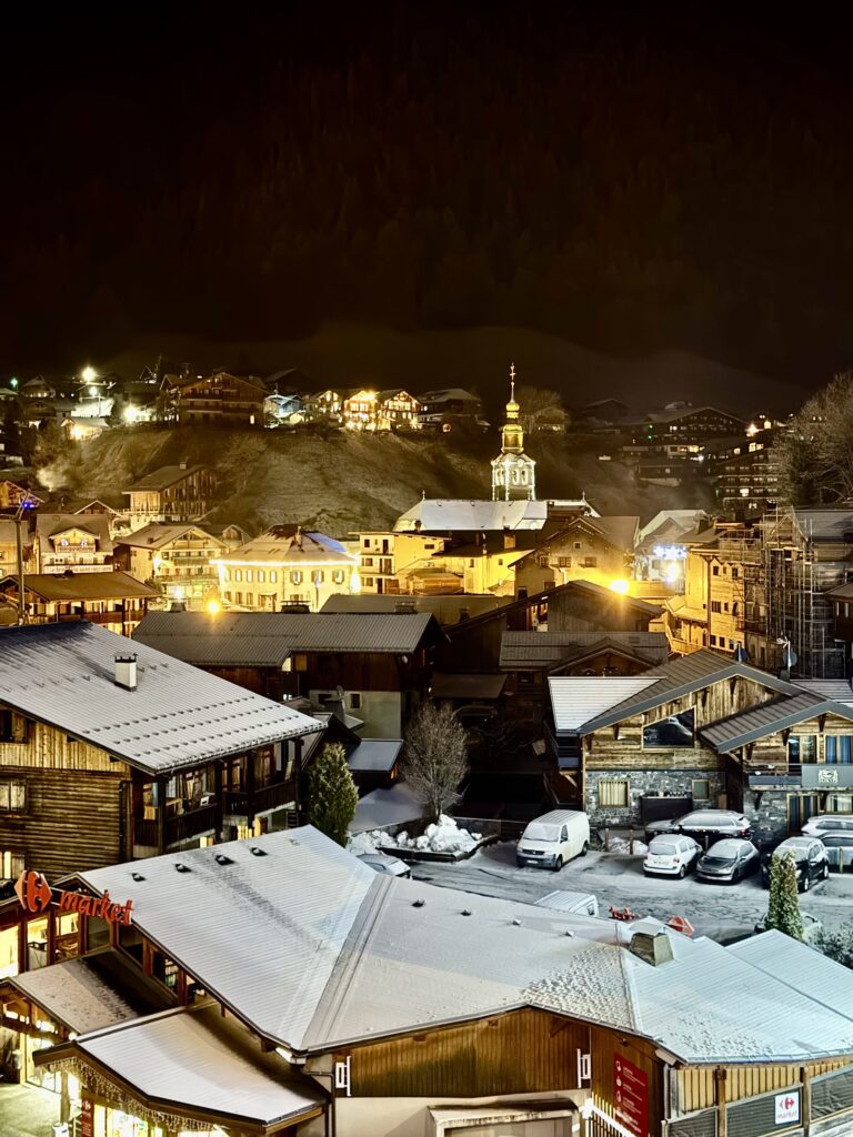 Juste en dehors de Morzine, sur la route vers Avoriaz, près du sommet du Super Morzine, se trouve l’un de nos endroits préférés — un lieu calme avec une vue dégagée sur toute la vallée. La nuit, les lumières de Morzine scintillent en bas tandis que les montagnes s’effacent dans l’obscurité. Depuis ce point, vous pouvez même accéder directement aux pistes depuis le van, pour être sur les skis dès les premières traces du matin, sans passer par un parking bondé.