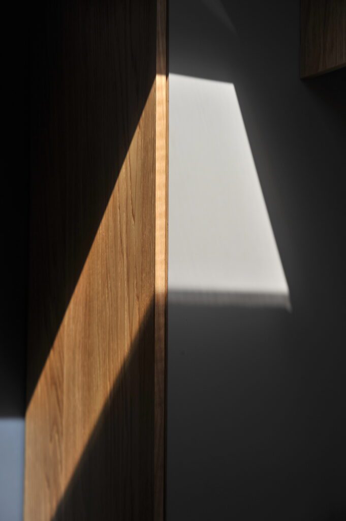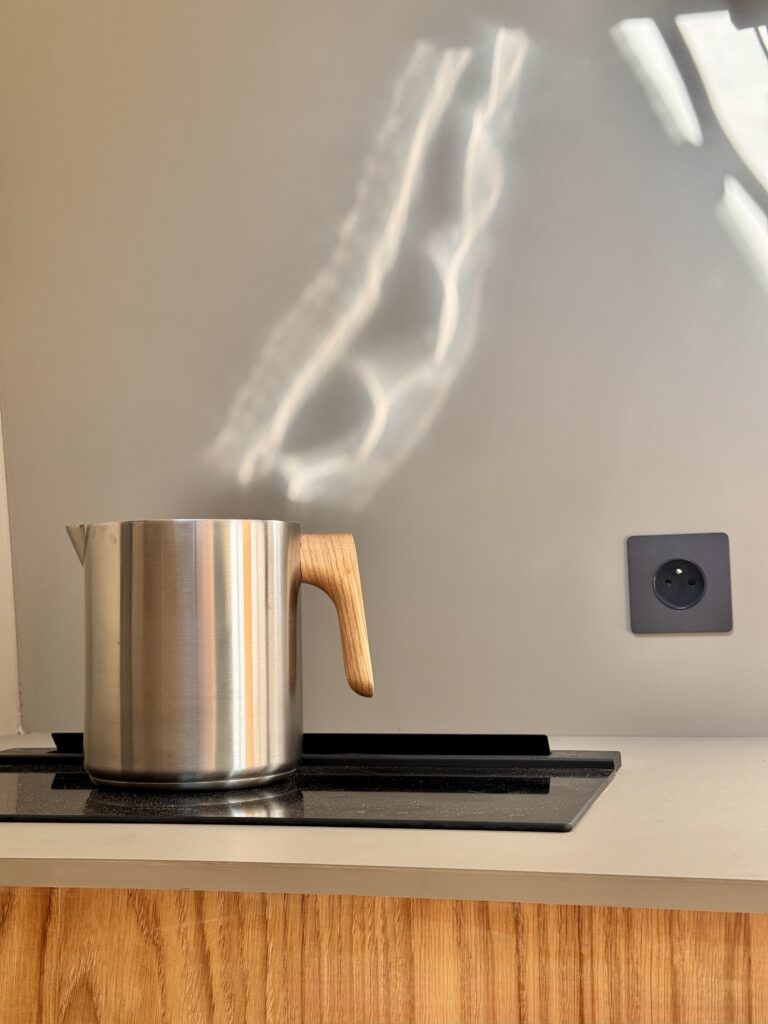 Sa teinte chaude et mate s’accorde avec les portes en chêne massif, le sol Bolon et les tissus Designers Guild. L’ensemble crée une palette sobre inspirée du minimalisme scandinave, où la qualité des matériaux et des textures prime sur le contraste ou la décoration.